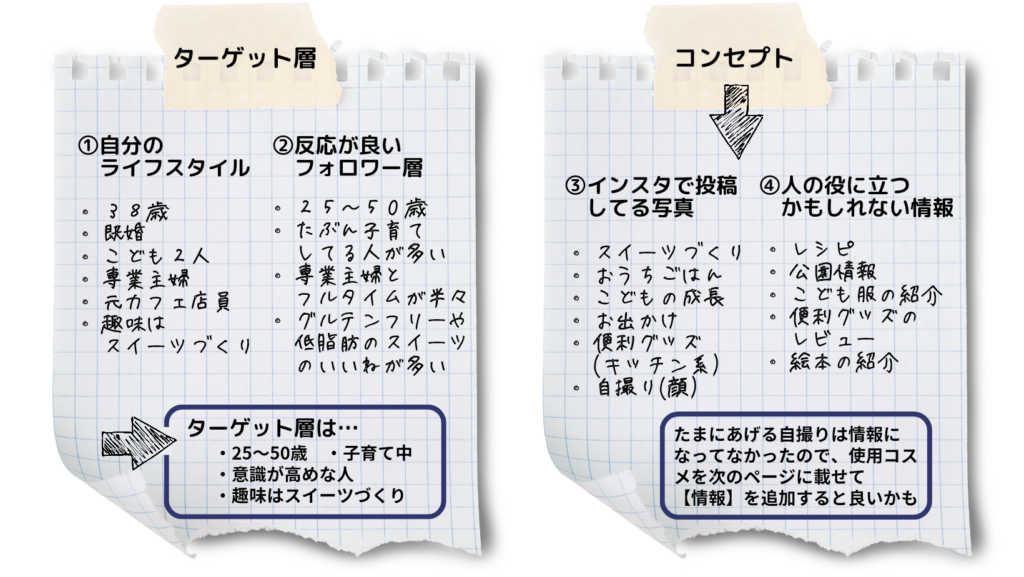 いま書き出した4項目が、そのままコンセプトとターゲット層になります。